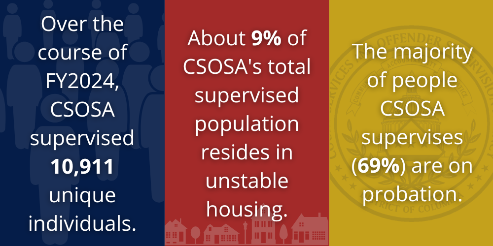 Over the course of fiscal year 2024, CSOSA supervised 10,911 unique individuals in the District of Columbia. On any given day during FY 2024, CSOSA supervised an average of 6,581 people. On September 30, 2024, there were 7,117 individuals under CSOSA supervision.